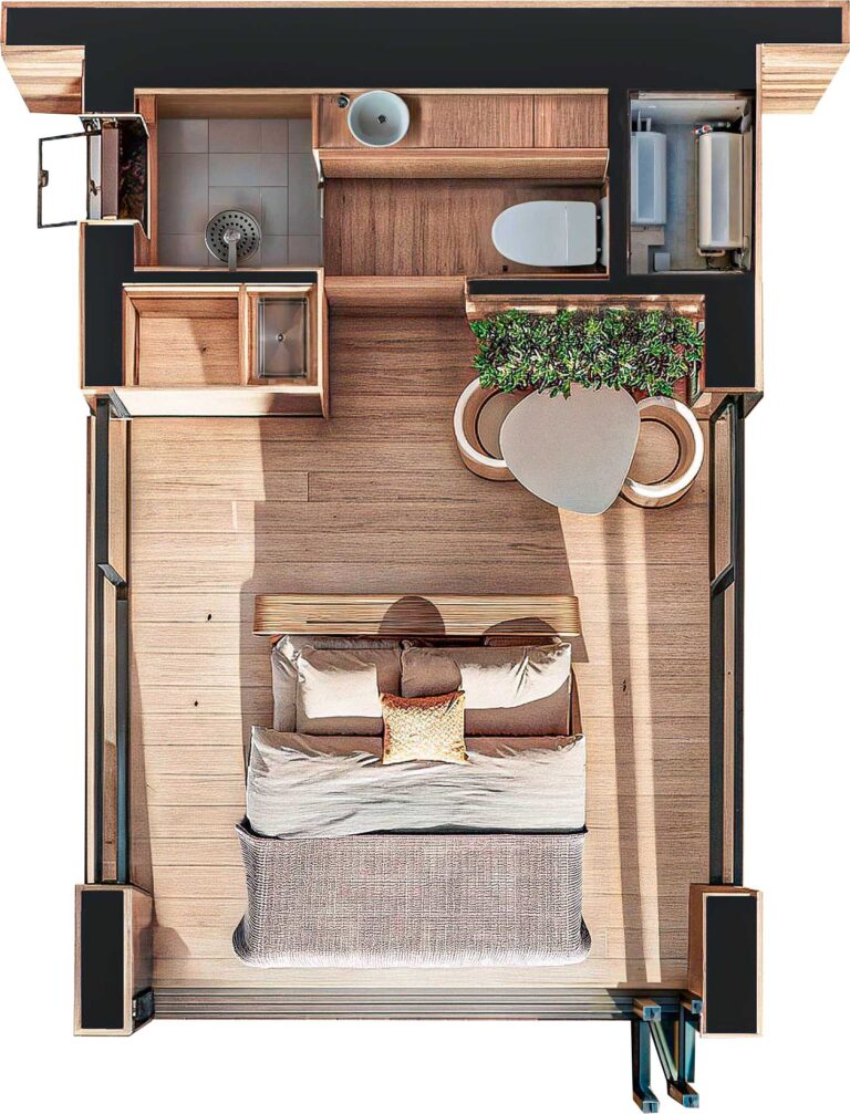 - Flexible Open Space: 170 sq. ft. (moveable bed + sitting area+ built-in closet and kitchenette)