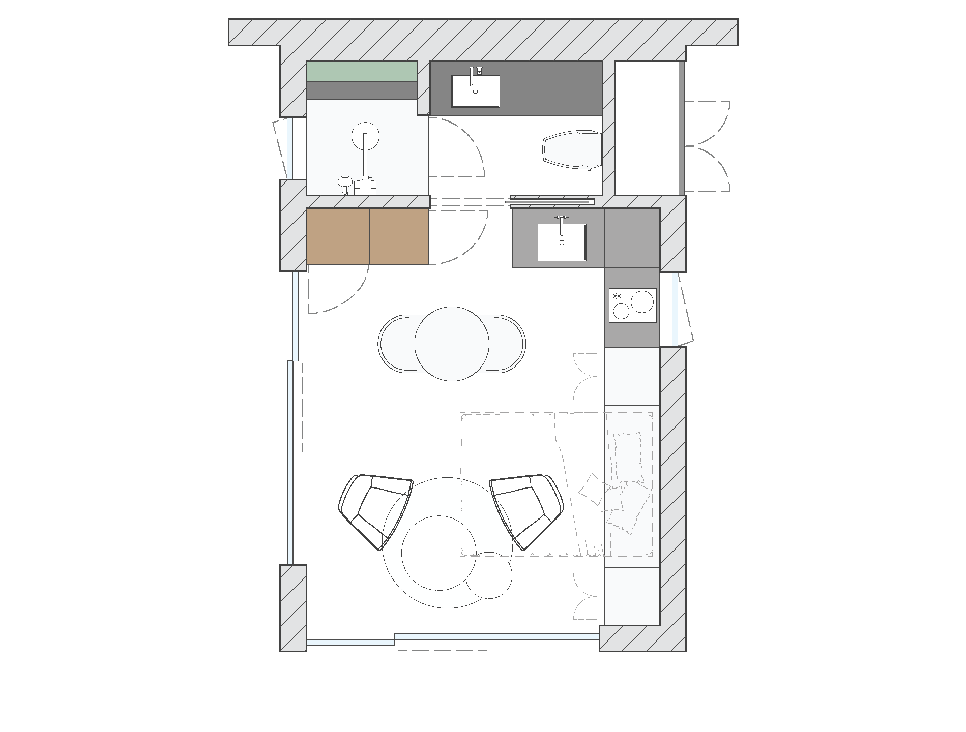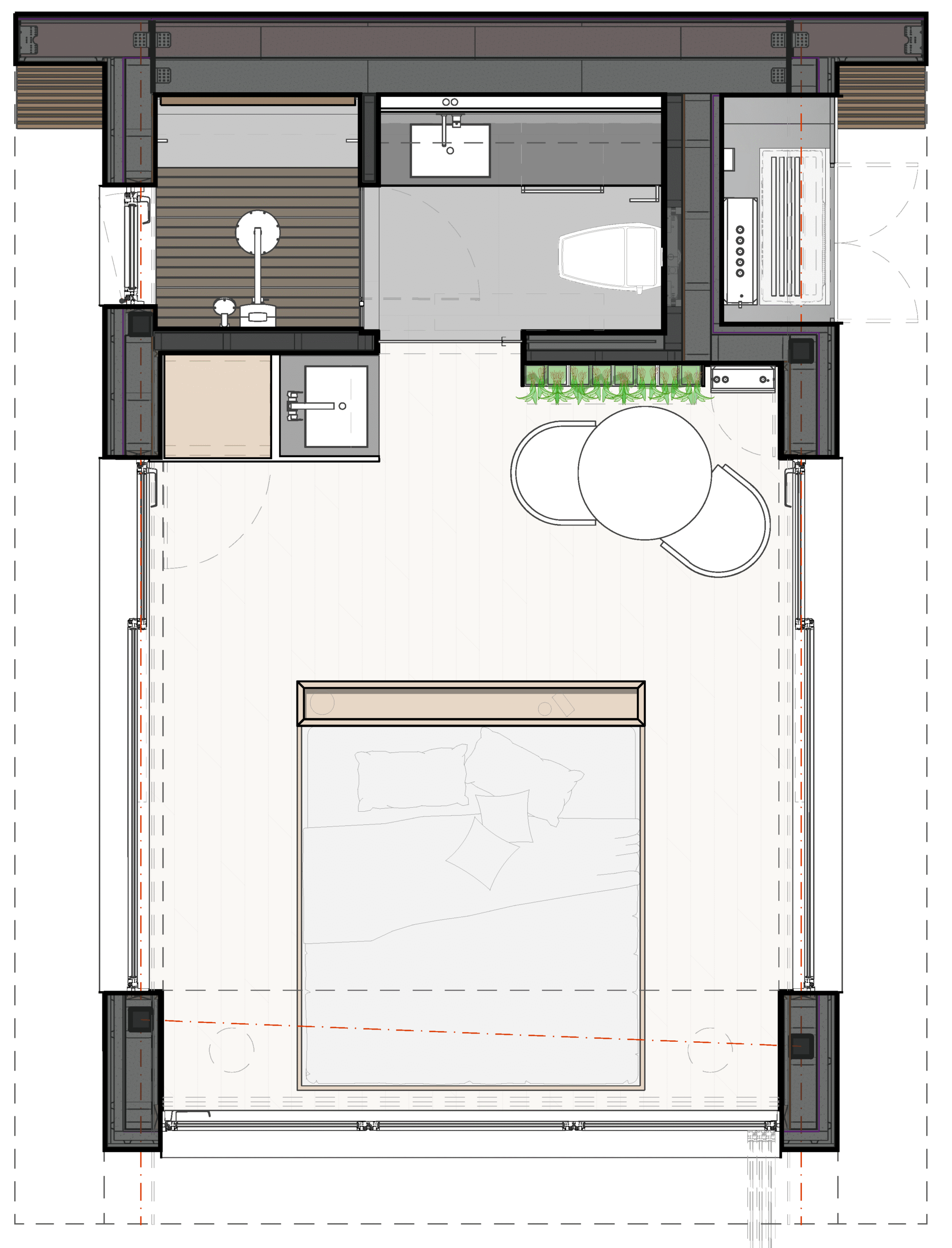 - Sitting area with optional vertical garden or moss wall.